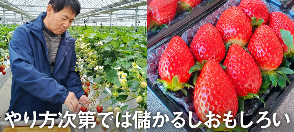 【農業経営の状況】 農地:20a(自作地) 施設:ビニールハウス14a 経営内容:いちご14a 労働力:本人、妻、雇用5名 出荷先:直売、JA直売所